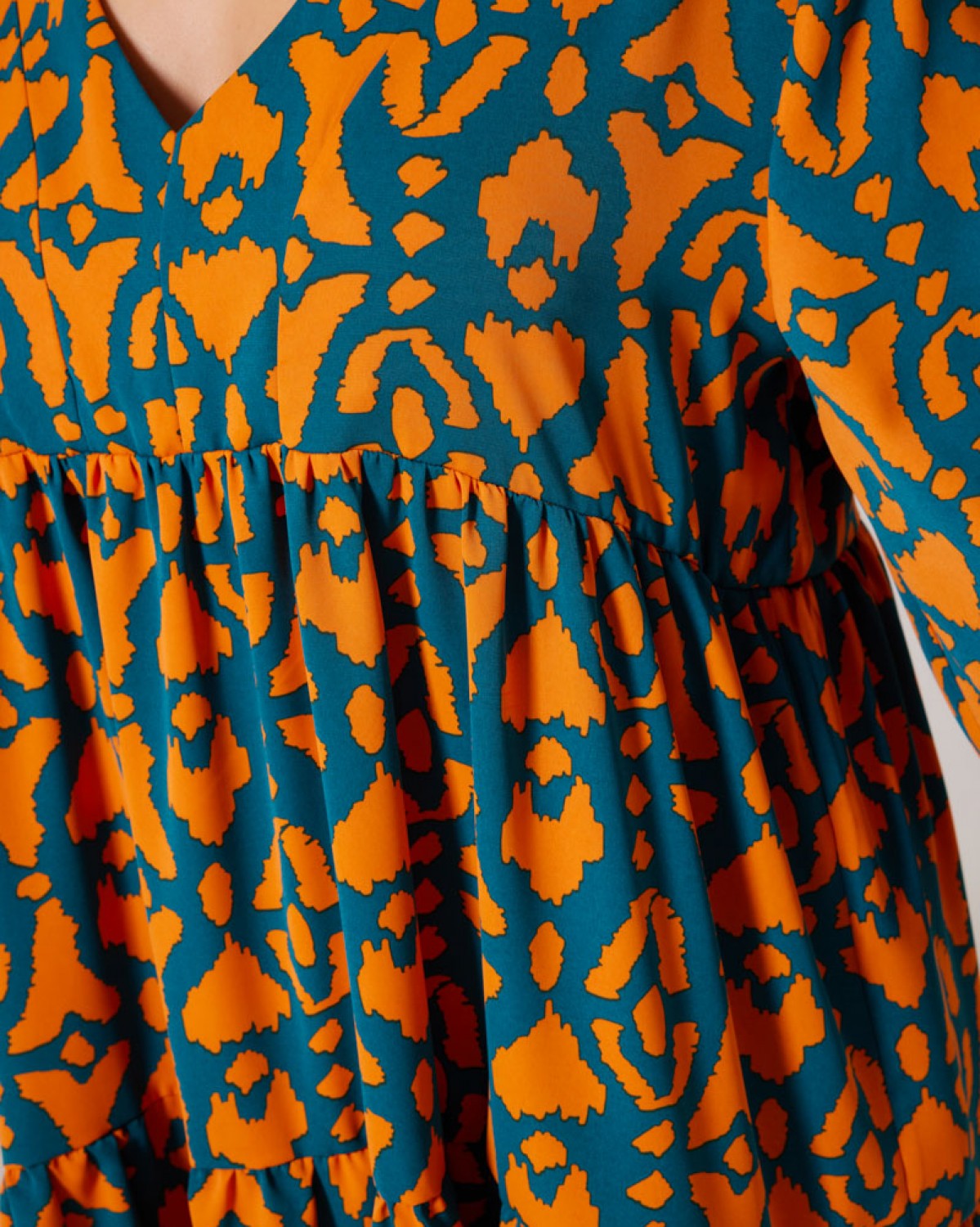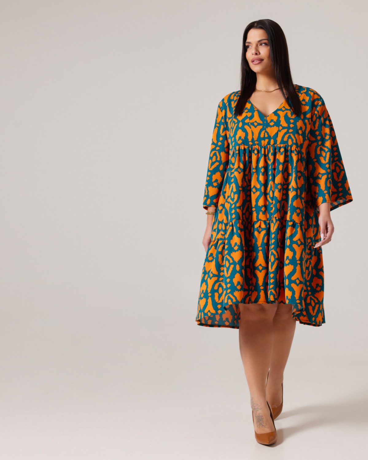Φόρεμα Με Καμπάνα Μανίκι Εμπριμέ Πράσινο-Πορτοκαλί