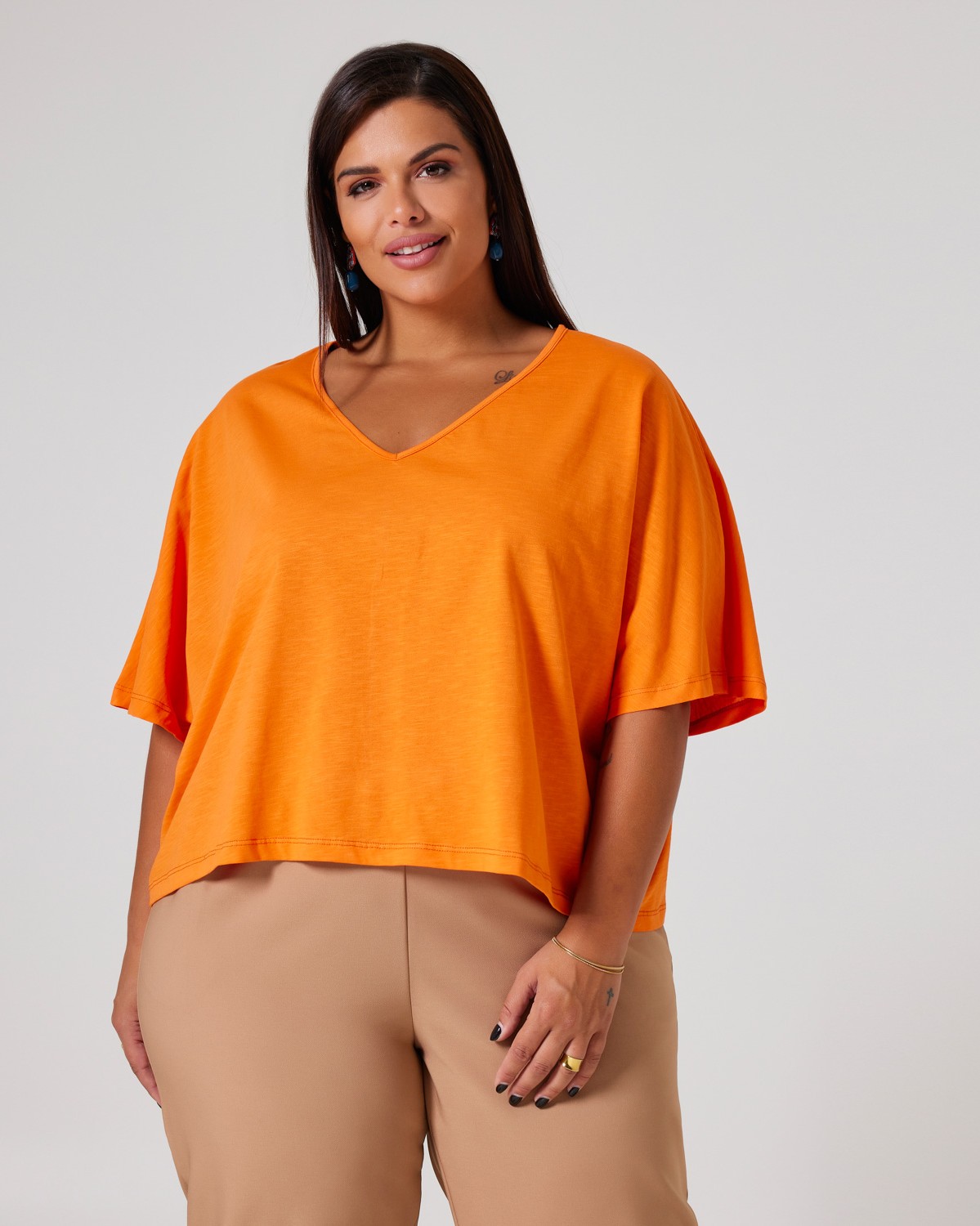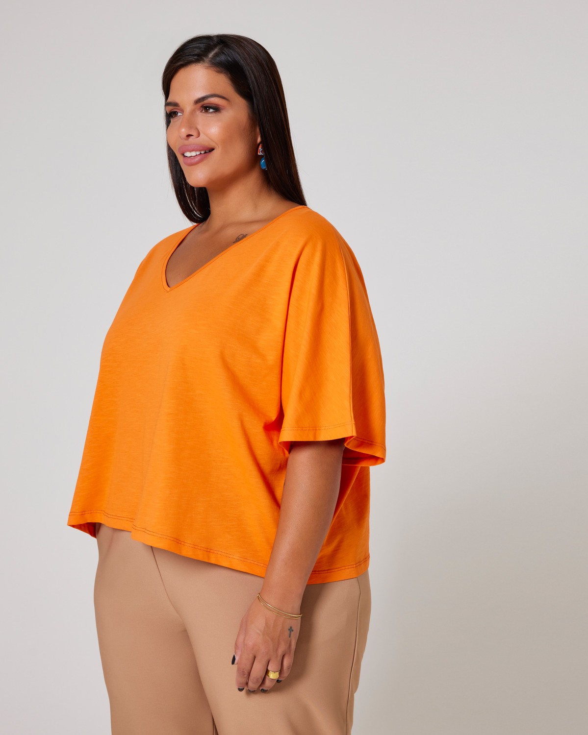 T-Shirt Βαμβακερό Κοντό V Πορτοκαλί