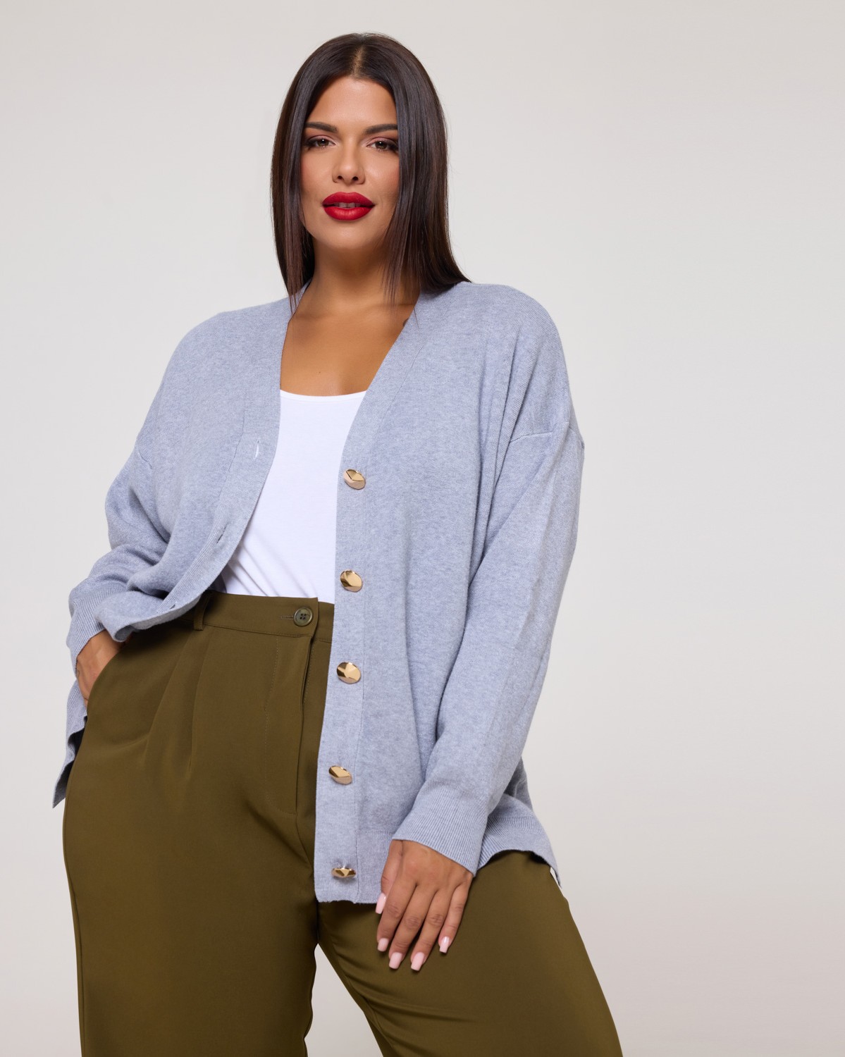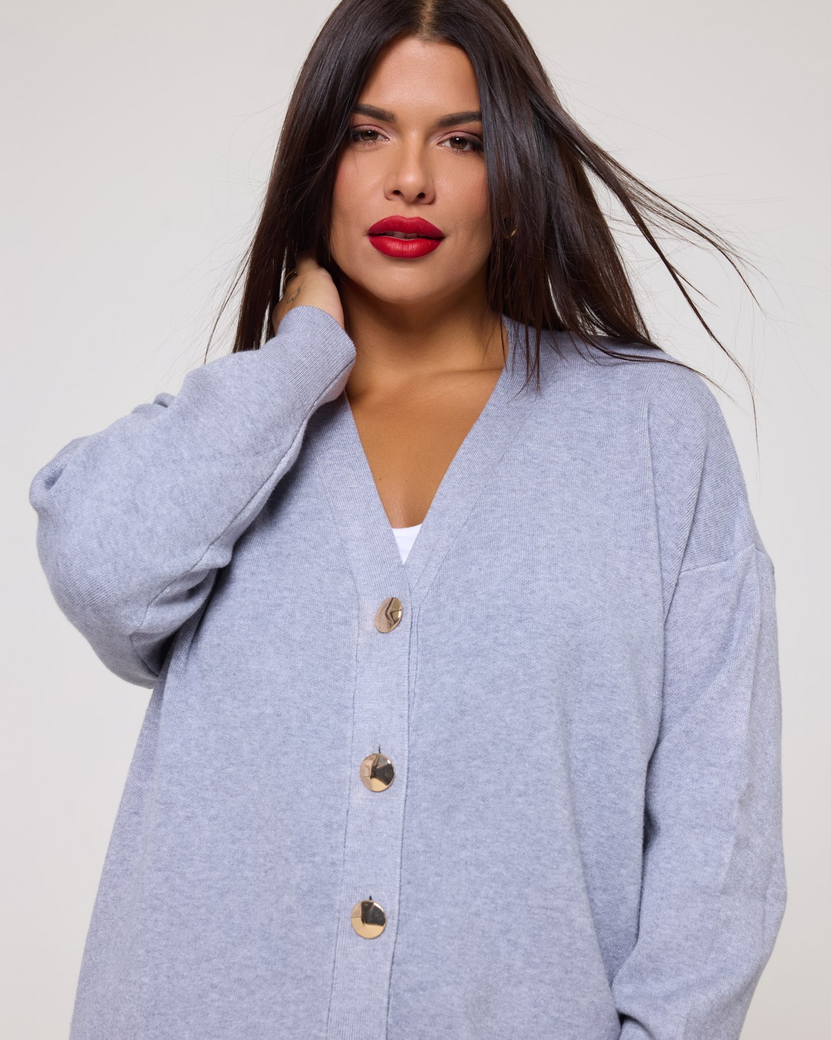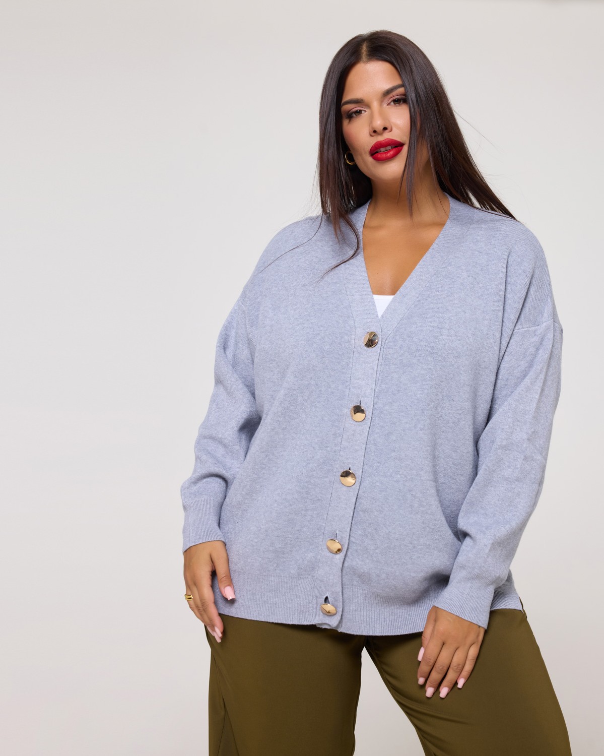 Πλεκτή Ζακέτα Με Μεγάλα Χρυσά Κουμπιά Γκρι Μελανζέ